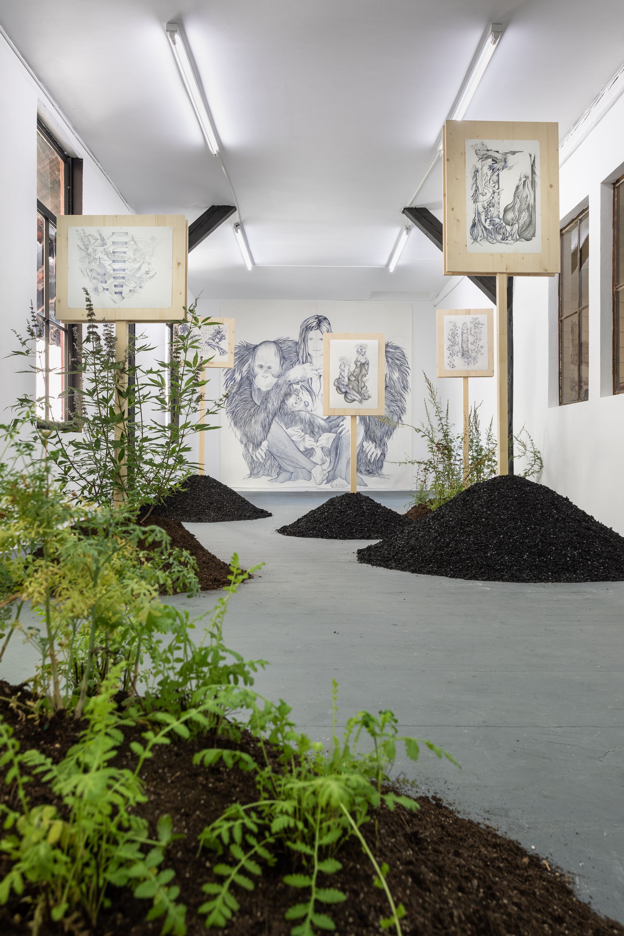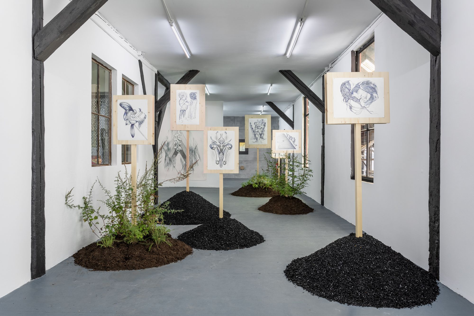 The image could be read as a sign on a pauper's grave. But it is impossible to see this garden as wholly negative. It is rather a pharmakon, a series of signs that can either mean "poison", or "remedy" depending on the dosage, and depending on your perspective. These mounds are either unmarked graves, or they rather hold signs from a peaceful protest, a vigil, in which the works stand witness to, or watch over, you and your future. Your mind is wandering. This room text is too long. But it is important not only to be Rampant, Dexter, it's also important to be Regardant, to that which is Sinister.
