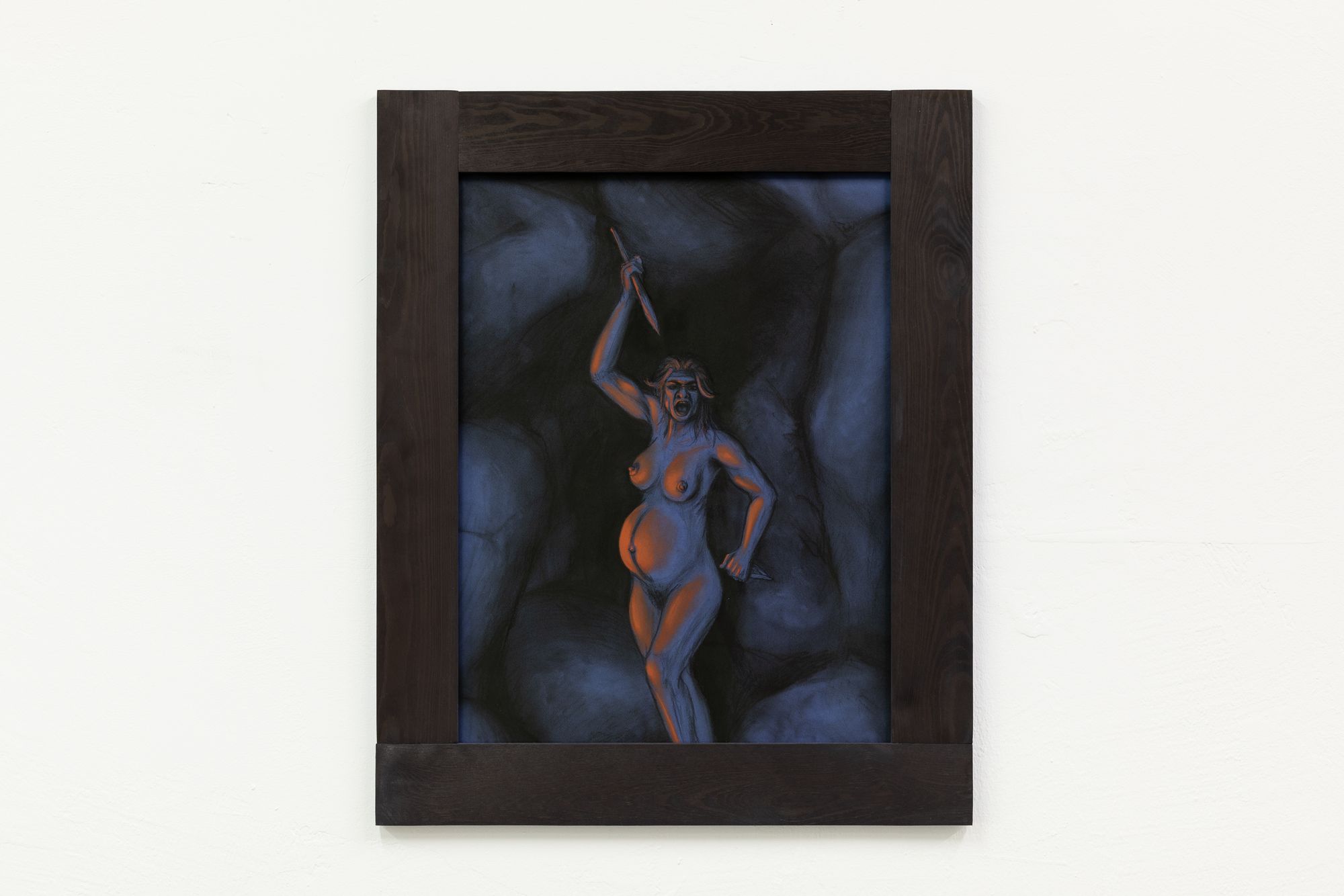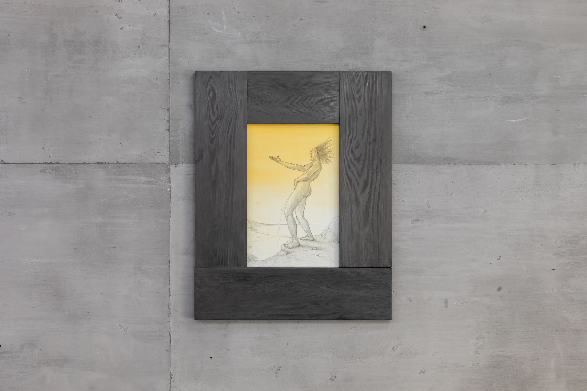 The work that you see on the right of the entrance is a silver point by Rasmus Myrup, on heavy stock. There is a female neanderthal, triumphant, urinating, her position, in the language of heraldry (which runs like a secret thread through this show), would be dexter rampant. There is a yellow cast to the background. Is it a new dawn or a sunset? Rasmus' works are heavy with ambiguities. They displace us into an imagined human prehistory, one that slips the knot of the caveman family image of prehistory, the Flintstones-as-nuclear-family in their suburban cave. It's difficult to remember that the Flintstones were themselves progressives once, an attempt to present troglodytes, the ultimate other, as not just out to club you and drag you back to the cave, but just like us. Except that then, we were the ones who changed.