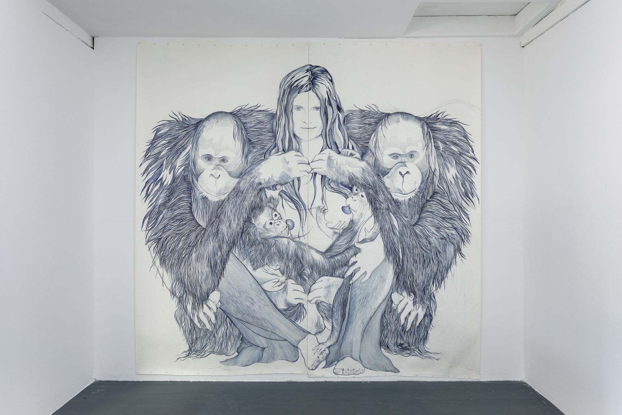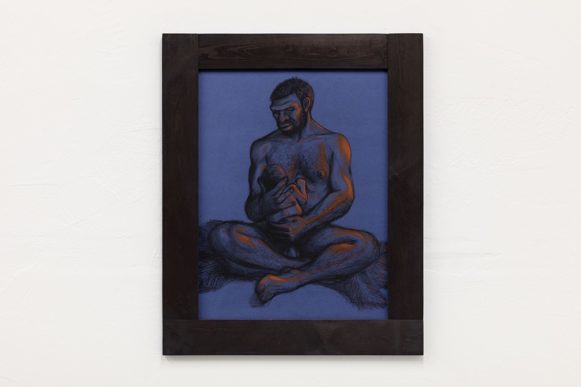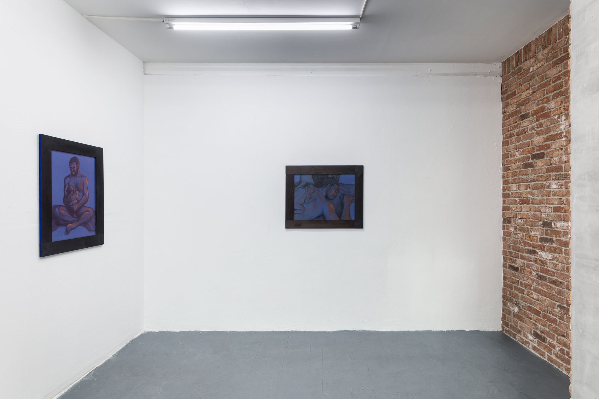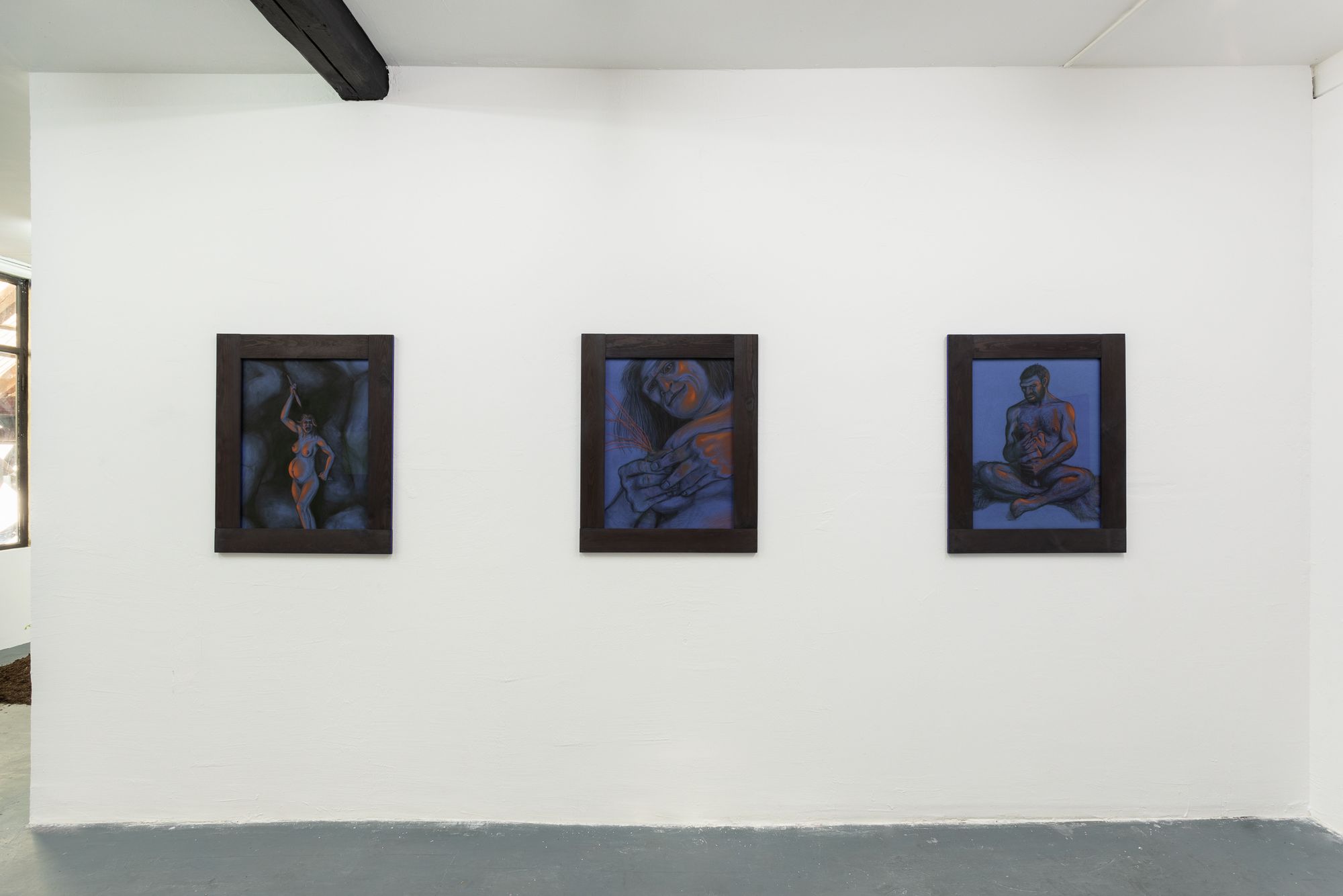 Note the switch from silverpoint to pierre noire and sanguine in Rasmus' series along the wall now behind you. The lovingly studied musculature could almost be a disegno, a preparation for a Renaissance painting. But these are no academic studies of idealised beauty, of the harmony of sensuality and morality before the fall. Look at the careful rendering of the hair, the fur, afforded as much attention as the flesh. Pierre noire and hair: all that is left of the animal after a hunt. This is about the irreconcilable strangeness of our own appetites. We are all cavemen, right now. In our caves, with our flickering memes. That's why you are reading this roomsheet. Because the other people in the cave are making you nervous.