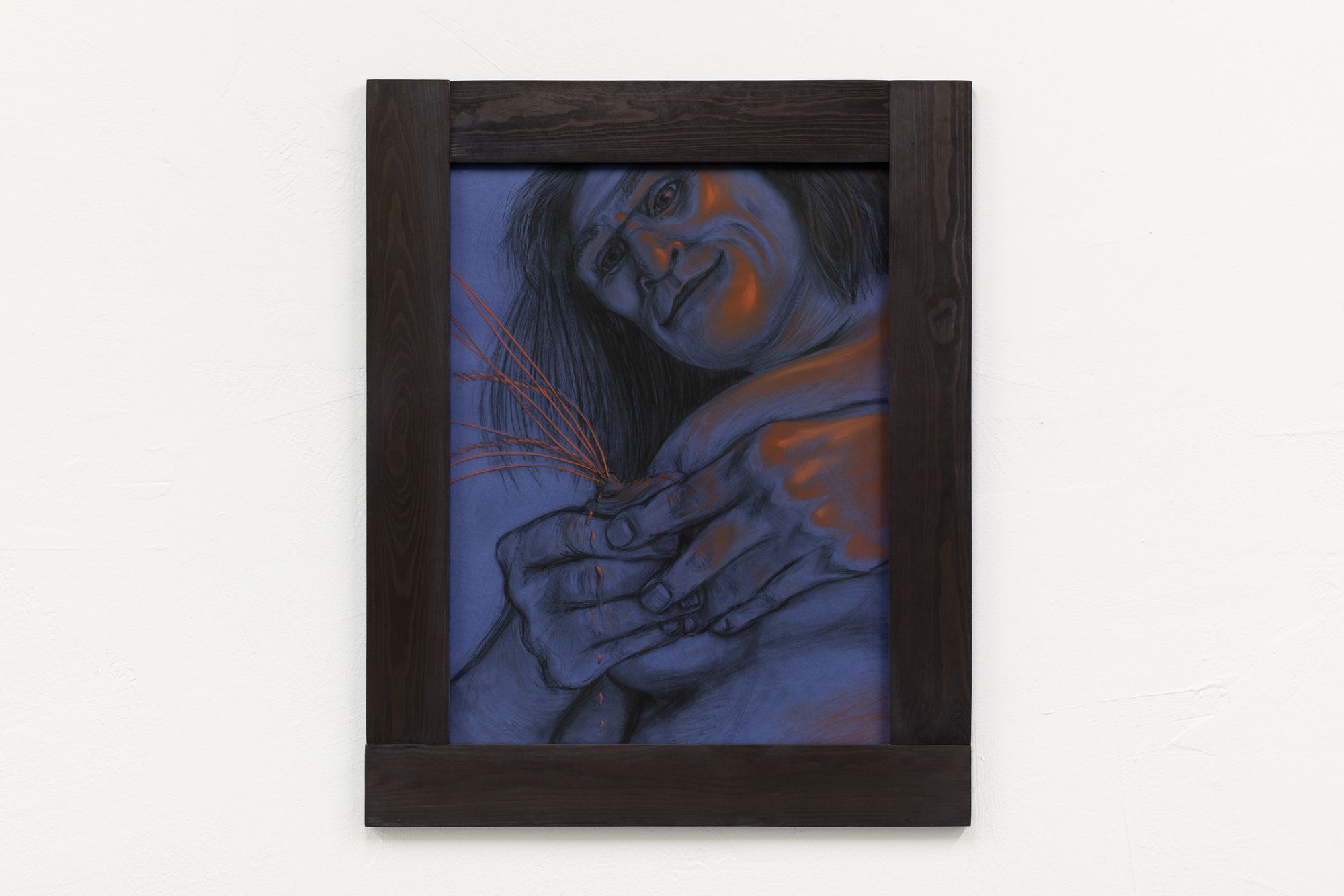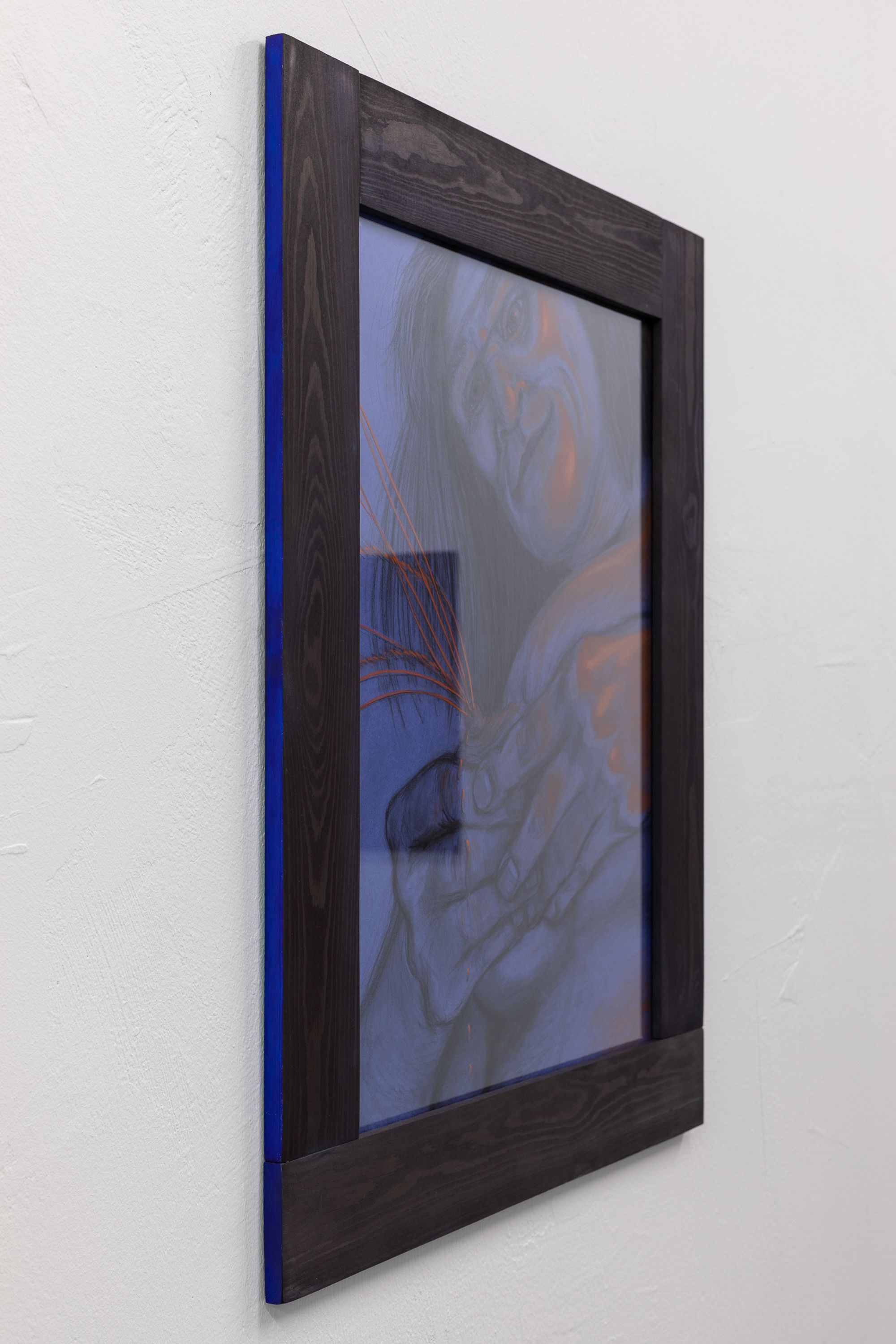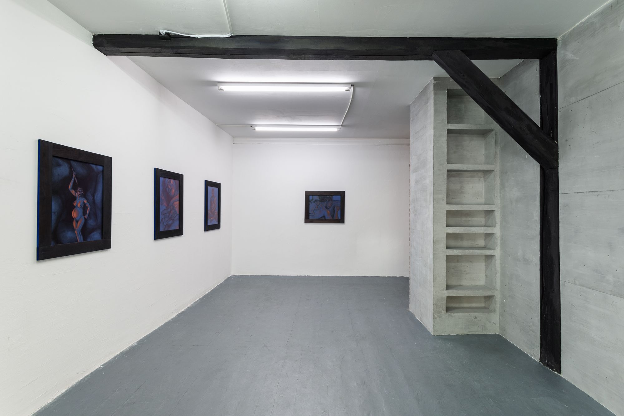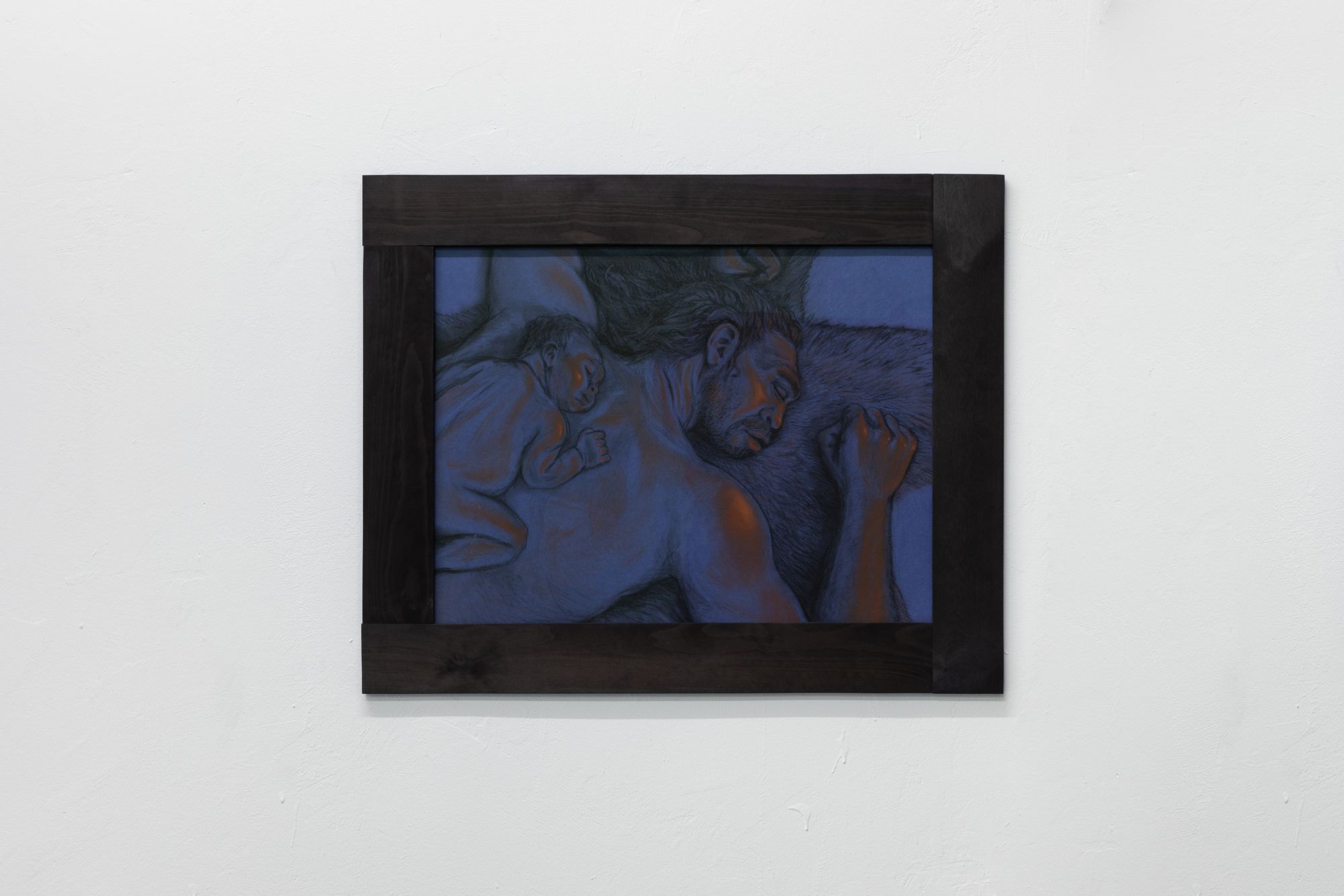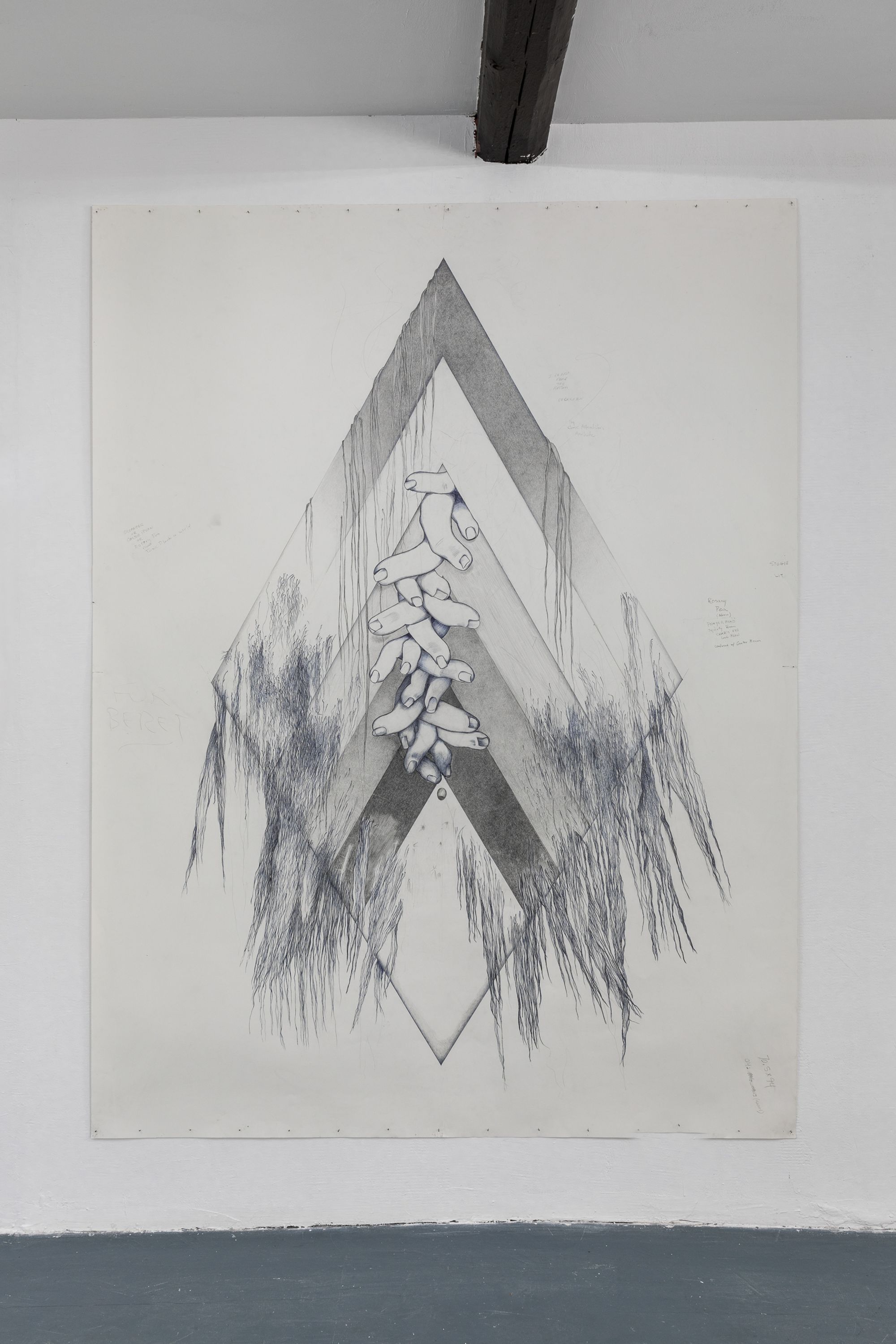 Note the switch from silverpoint to pierre noire and sanguine in Rasmus' series along the wall now behind you. The lovingly studied musculature could almost be a disegno, a preparation for a Renaissance painting. But these are no academic studies of idealised beauty, of the harmony of sensuality and morality before the fall. Look at the careful rendering of the hair, the fur, afforded as much attention as the flesh. Pierre noire and hair: all that is left of the animal after a hunt. This is about the irreconcilable strangeness of our own appetites. We are all cavemen, right now. In our caves, with our flickering memes. That's why you are reading this roomsheet. Because the other people in the cave are making you nervous.